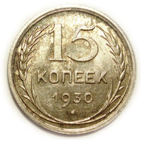 СССР. 15 копеек 1930. Брак, грубая шлифовка штемпеля реверса, холостое соударение штемпелей. Торг.