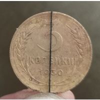 СССР. 3 копейки 1930. Брак, край листа и холостое соударение штемпелей. Торг.